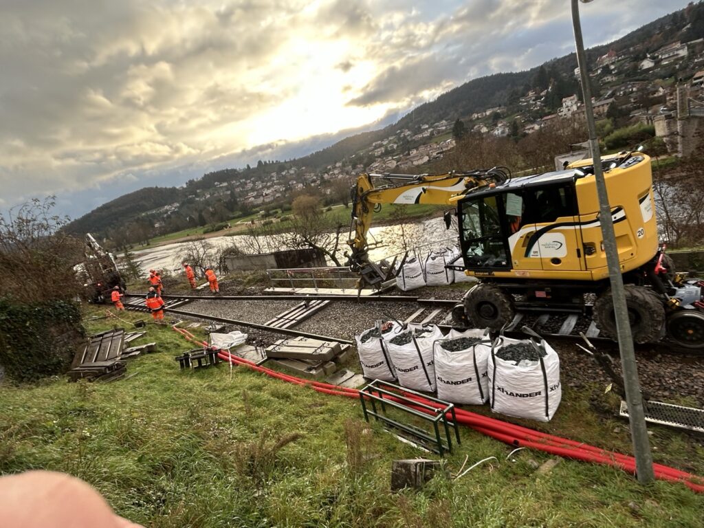 Deux pelles rail-route ont travaillé pendant 2 mois pour le compte de la société Colas Rail sur leur chantier de RVB du Puy en Velay. Une grande partie des travaux s’est déroulée à la gare du Puy-en-Velay (43). Grâce notamment à nos équipes, le chantier a pu se terminer à temps et a permis une réouverture de la ligne ferroviaire pour décembre.